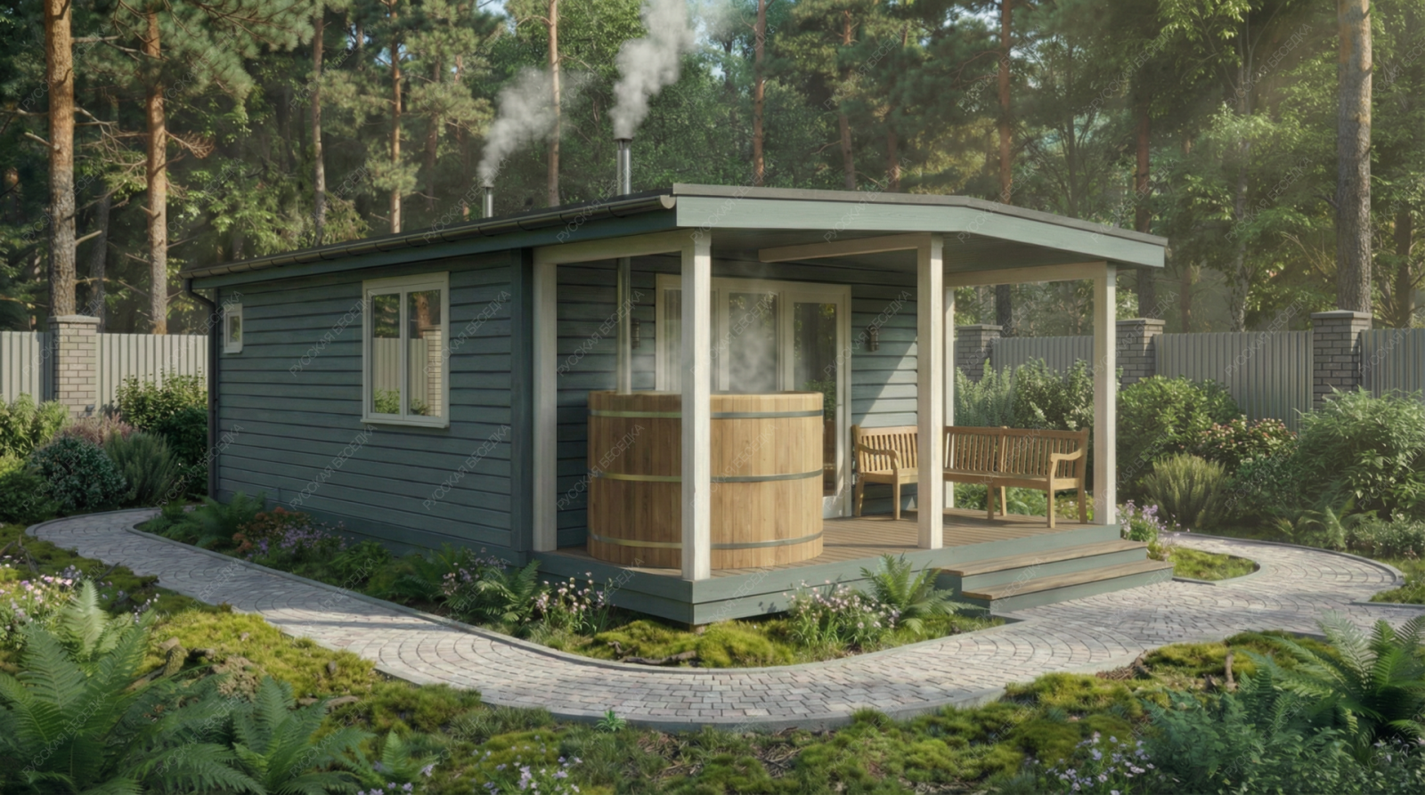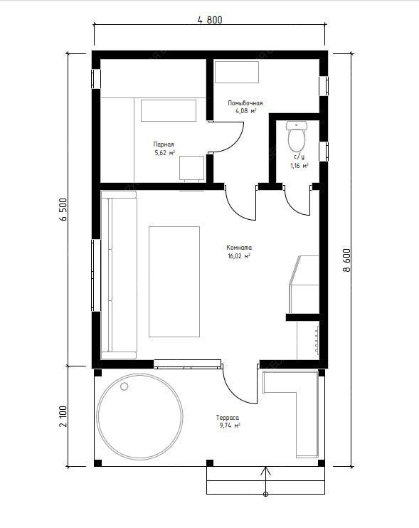 Баня «Сильвана» — это проект для тех, кто ценит простор и многофункциональность. Компоновка с открытой террасой и классической двускатной крышей предлагает сбалансированное пространство как для уединенного отдыха, так и для дружеских встреч. Просторная терраса площадью 9,74 м² становится логическим продолжением интерьера, идеальным местом для отдыха после банных процедур.  Ключевым преимуществом модели является её продуманная внутренняя организация. Просторная комната отдыха (16,02 м²) легко вместит большую компанию, создавая атмосферу теплого и гостеприимного клуба. Отдельная парная (5,62 м²) с окном-форточкой и изолированная помывочная (4,08 м²) обеспечивают гигиеничность и правильный банный микроклимат. Наличие собственного санузла (1,16 м²) добавляет бытового комфорта, повышая автономность строения. Общие габариты 4,8х6,5 м с террасой 4,8х2,1 м формируют солидное и представительное сооружение.  Качество исполнения, надежная двускатная конструкция крыши и натуральные материалы обеспечивают долговечность постройки и формируют ту самую аутентичную, целебную атмосферу, превращая баню «Сильвана» в полноценный центр релаксации и общения на вашем участке.