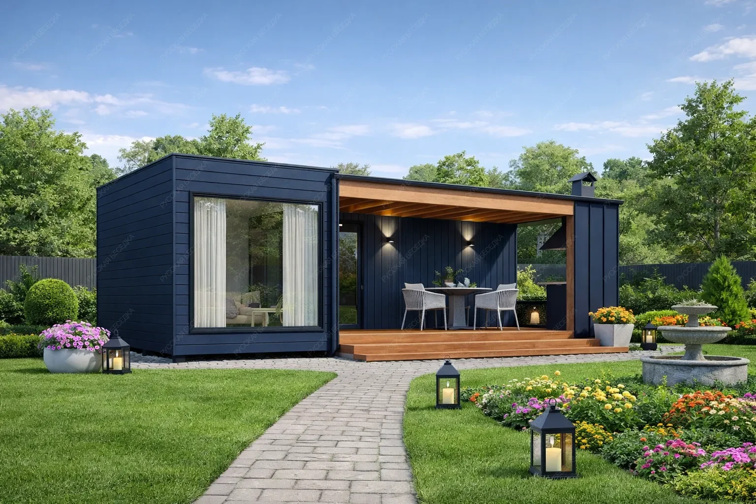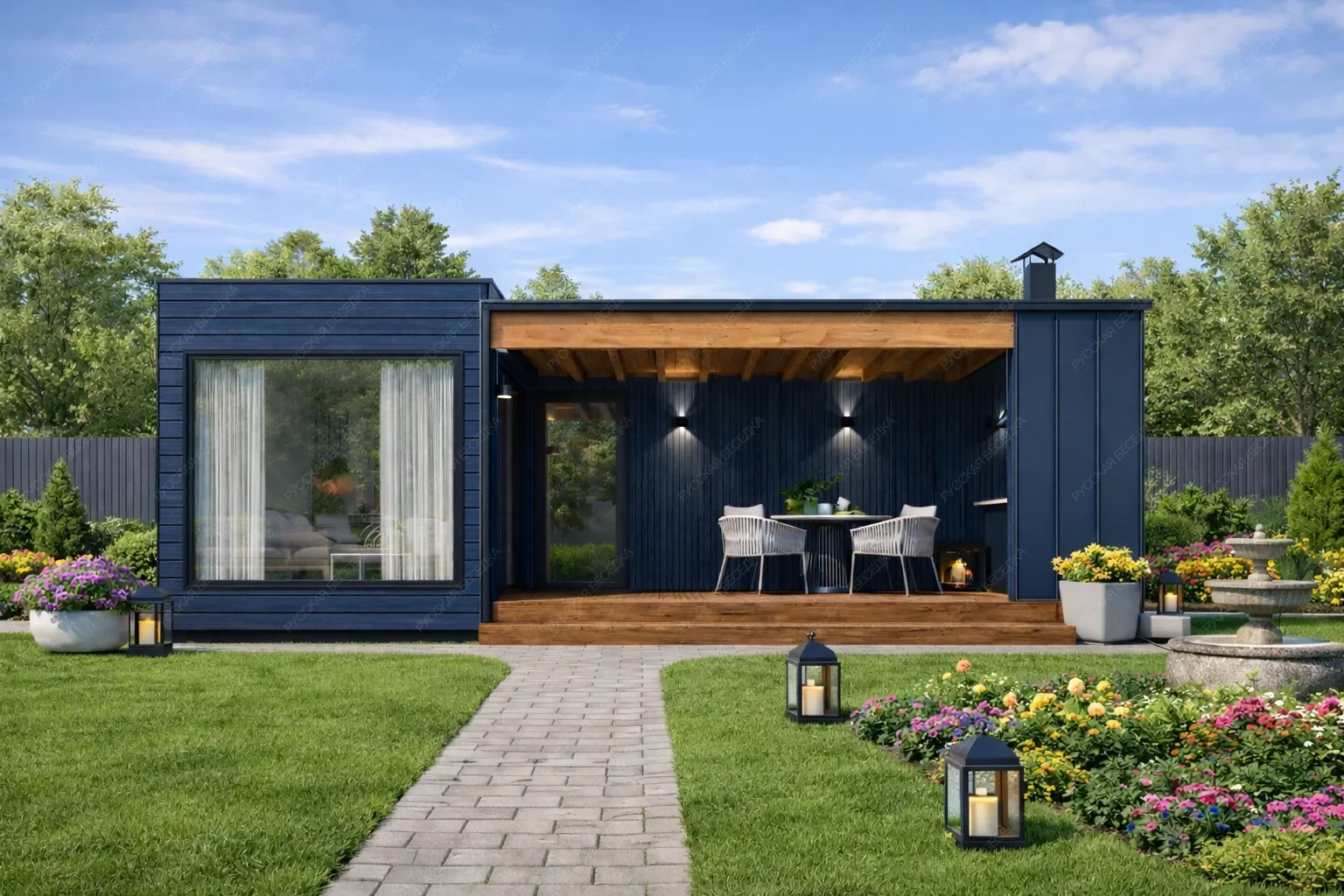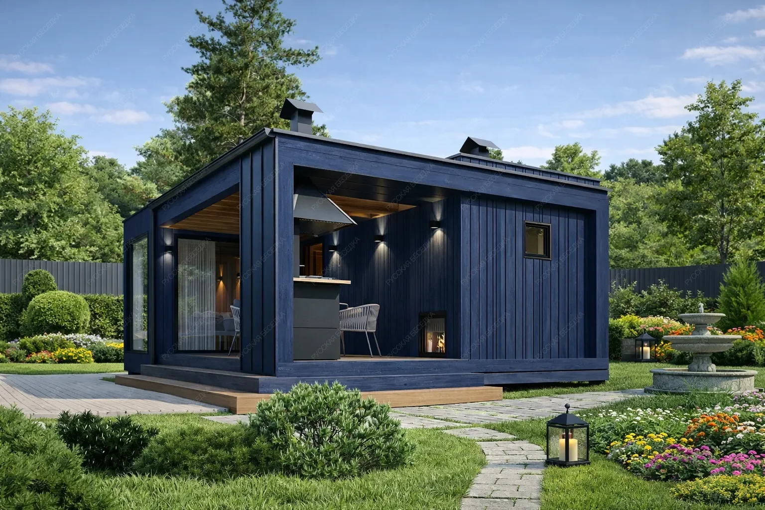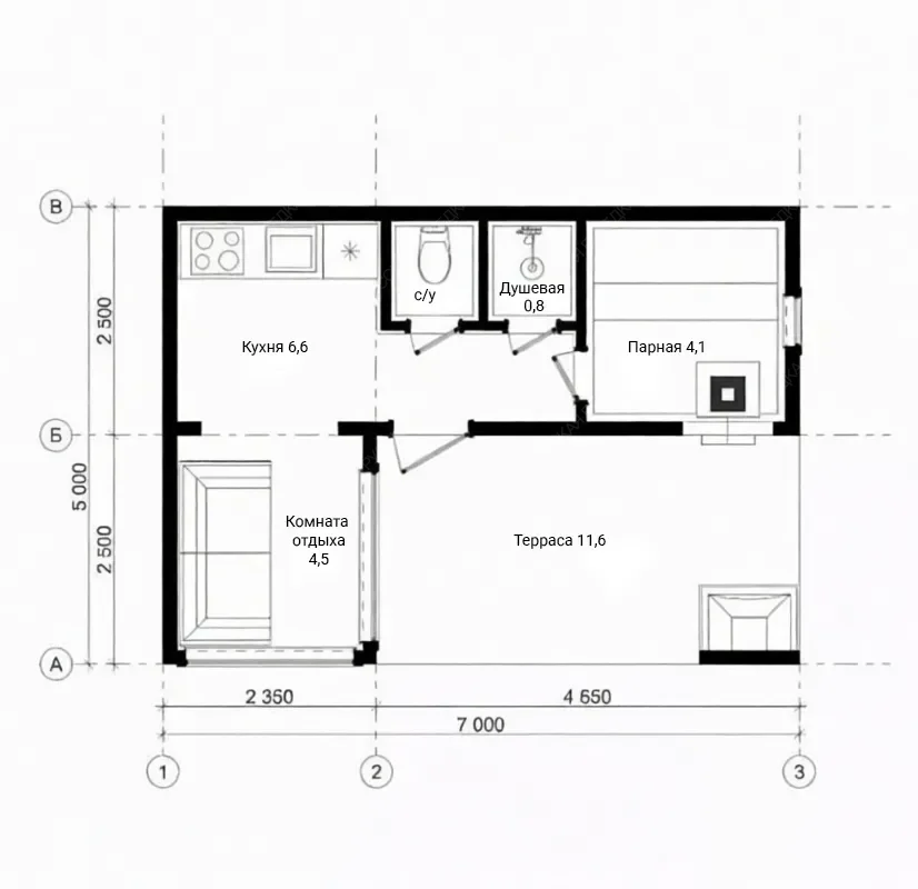 Каркасная баня «Живица» размером 5х7 метров с односкатной крышей представляет собой образец современного и рационального подхода к строительству. При общей площади 35 кв.м. проект предлагает необычно насыщенную планировку, где нашлось место для всех ключевых зон. Компактная парная, душевая и санузел соседствуют с отдельной кухней и комнатой отдыха, что превращает строение в многофункциональный гостевой комплекс. Односкатная крыша задает строению современный динамичный силуэт. Значительная часть площади отведена под просторную открытую террасу, являющуюся логическим продолжением интерьера и идеальной площадкой для отдыха. Такая компоновка демонстрирует эффективное использование каждого метра, где даже в малых габаритах достигается ощущение простора за счет грамотного зонирования и связи с внешним пространством. Это решение оптимально для участков с ограниченной площадью, не жертвуя при этом комфортом и функциональностью традиционной бани с дополнительными возможностями для приема гостей.