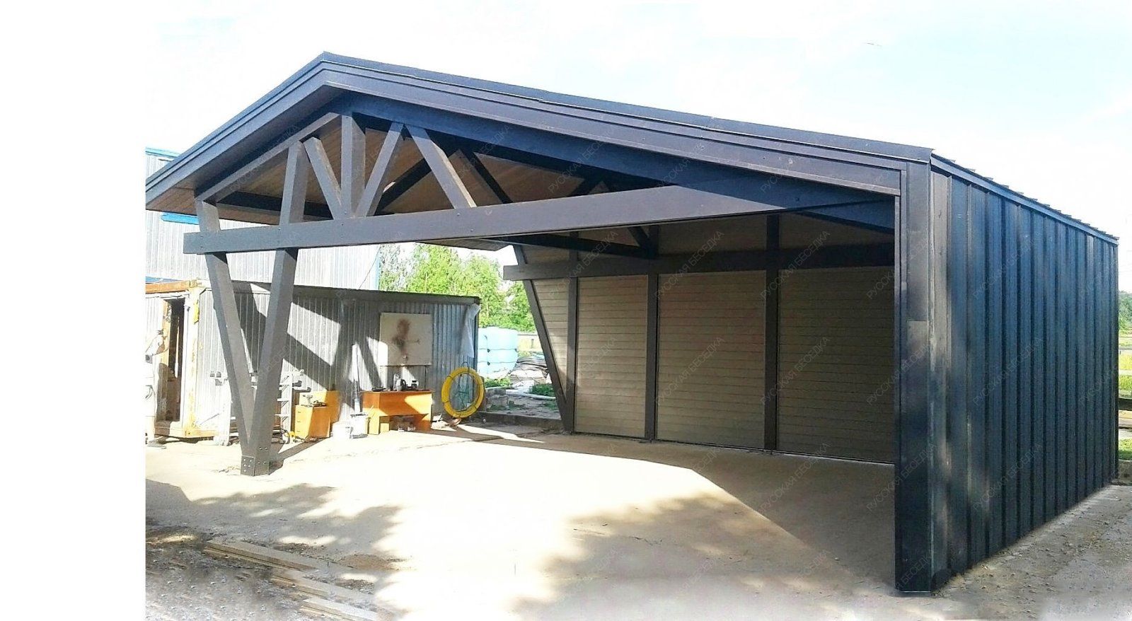 Навес из дерева послужит отличным парковочным местом для одного или нескольких автомобилей.