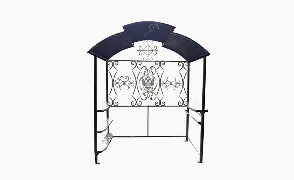 Для ценителей патриотической символики предлагаем великолепное изделие для сада или для дачи – кованный навес для мангала – «Империя». Навес изготовлен в виде цельносваренного каркаса. Размеры Вы можете выбрать и стандартные, которые прописаны в характеристиках изделий, и заказать конструкцию по своим параметрам. Максимальные параметры – 4000х2000 мм. Под навесом можно расположить любой мангал на ножках, печь под казан, тандыр или коптильню. Можно подобрать и разделочный столик, и табуретки или садовые кресла с лавочками. Боковые грани навеса оснащены удобными металлическими полками.