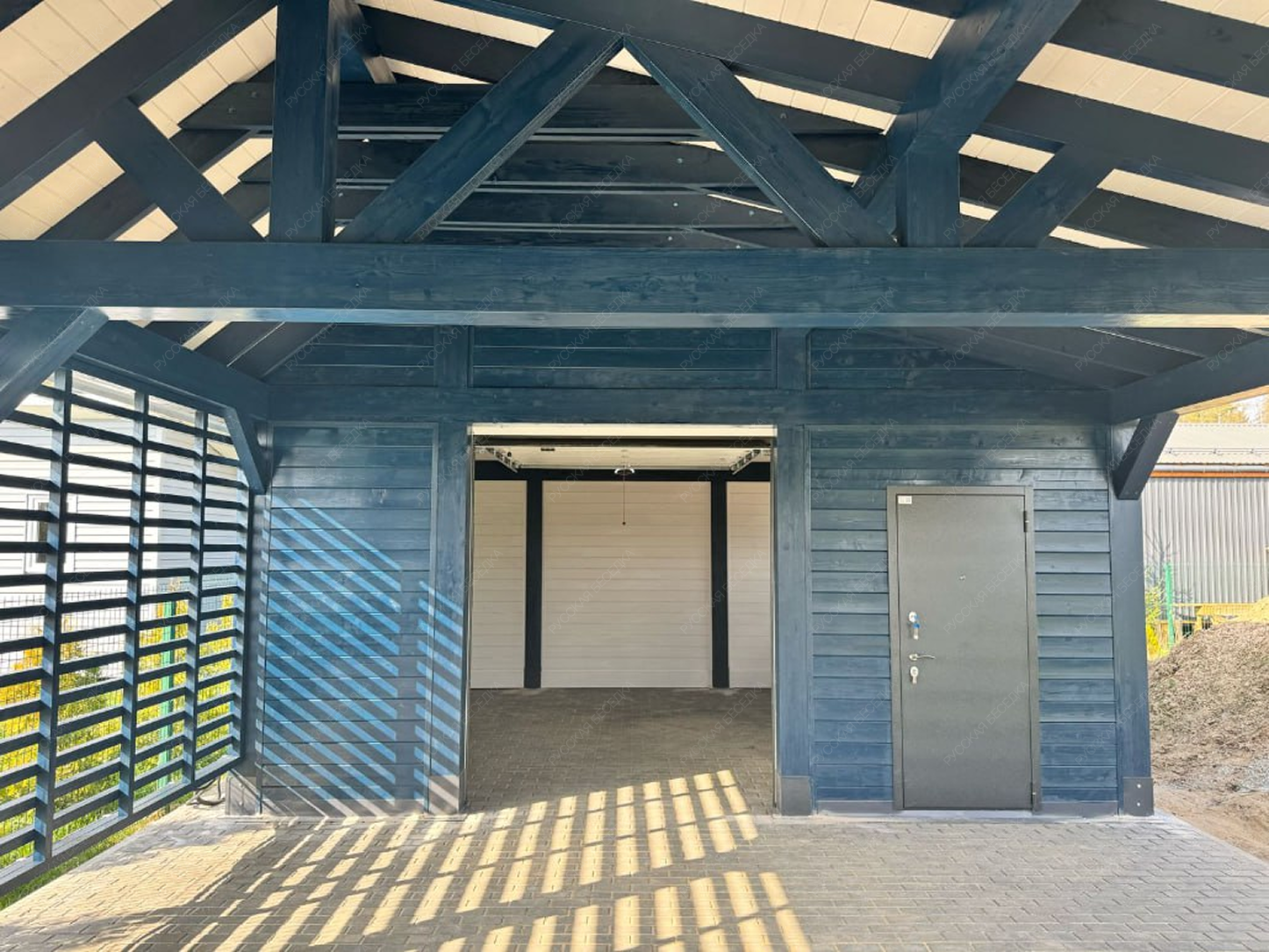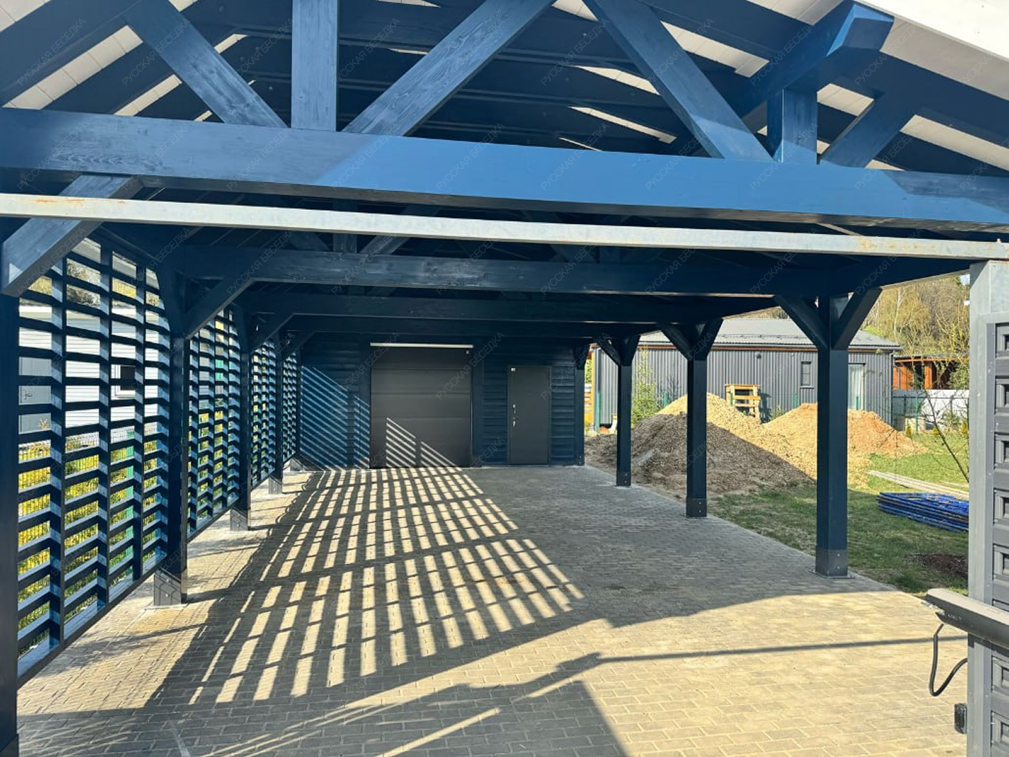Навес из дерева послужит отличным парковочным местом для одного или нескольких автомобилей.