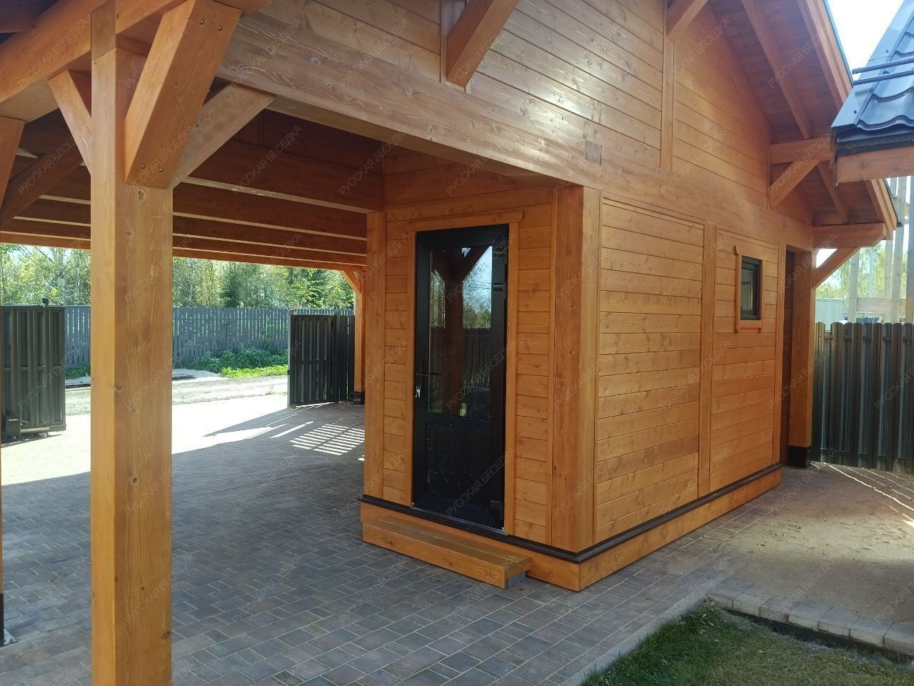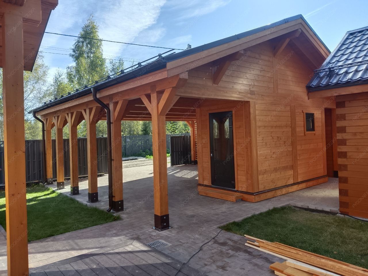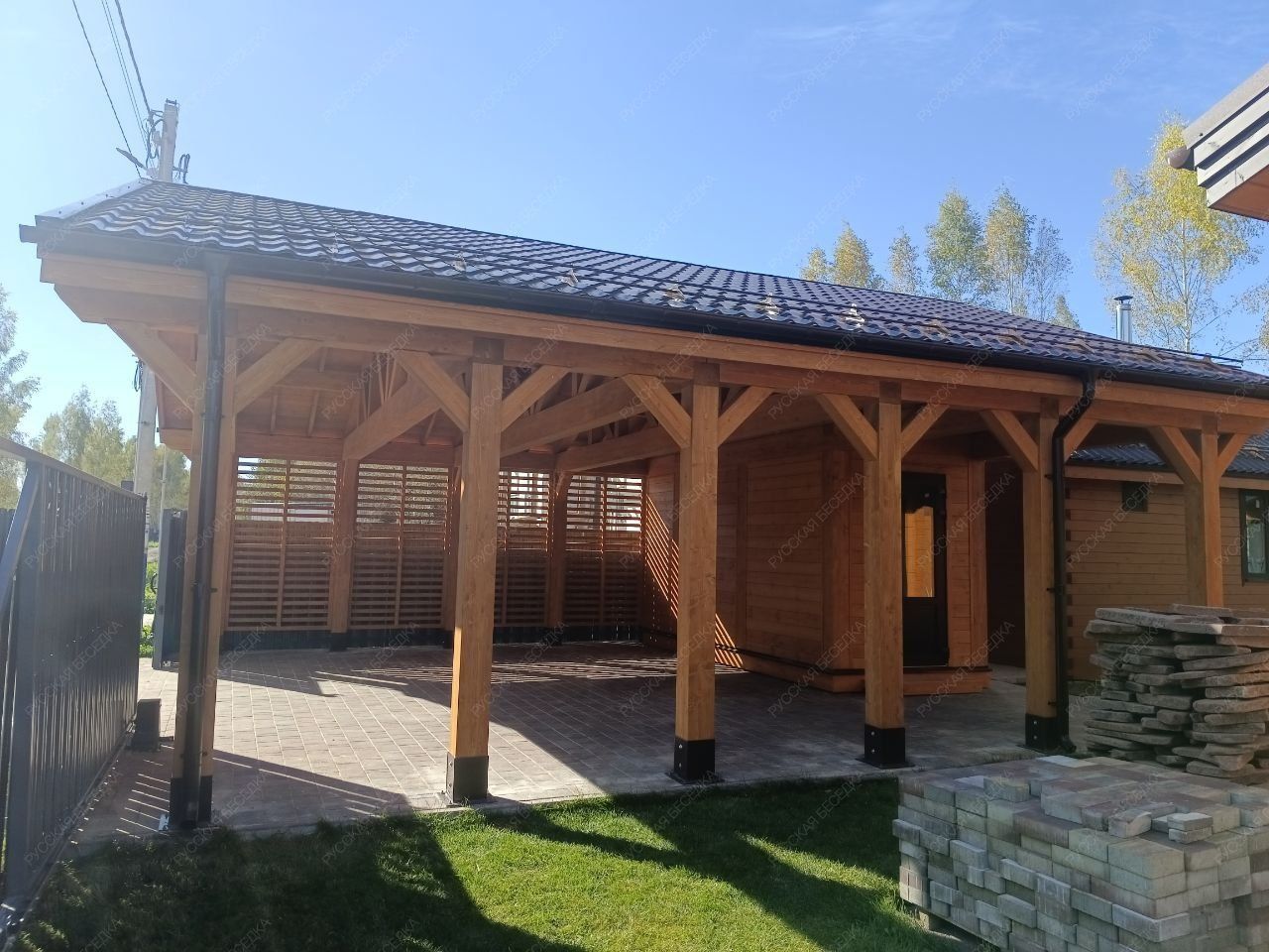 Навес из дерева послужит отличным парковочным местом для одного или нескольких автомобилей.
