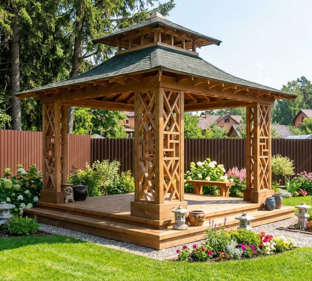 Современный ландшафтный дизайн и беседки - центральные элементы загородного участка. Беседка должна размещаться в таком месте участка, где вам будет комфортно находиться, а также она должна отвечать своему назначению и притягивать взгляды. Беседка является уникальным строением, с ее помощью можно отдохнуть за чашечкой кофе, укрыться от знойного солнца или провести шумный праздник в кругу семьи и друзей.