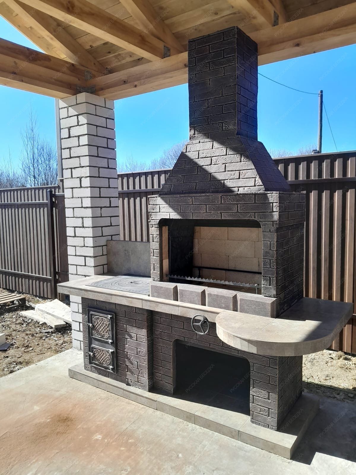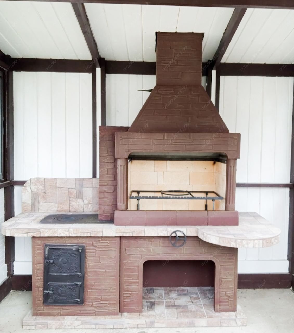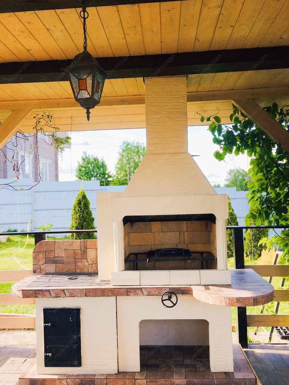 • Расширенная просторная топка, отделанная огнеупорным кирпичом. Она дополнена продуманной металлической решеткой. Последняя приспособлена для использования шампуров, гриль-решеток и разной посуды.