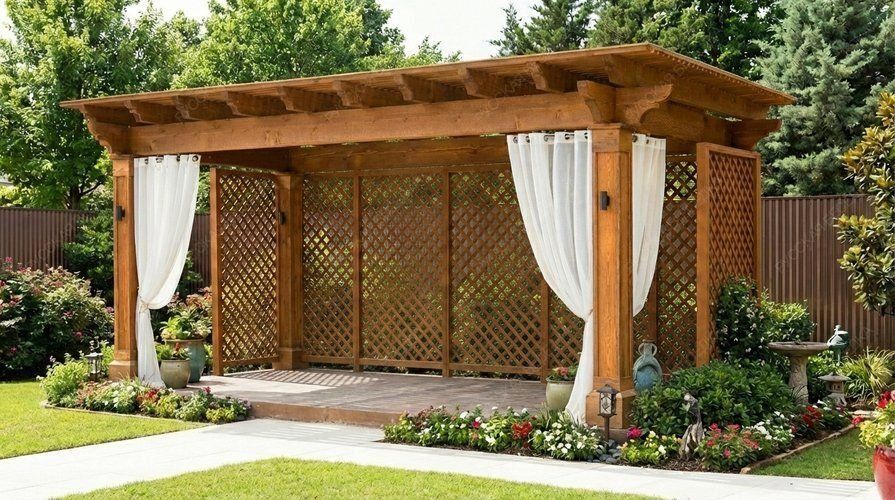 Пергола с навесом обеспечивает надежную защиту от солнечных лучей, создавая тенистое пространство для отдыха. Она станет идеальным местом для встреч с друзьями, чтения книг или приема пищи на свежем воздухе.
