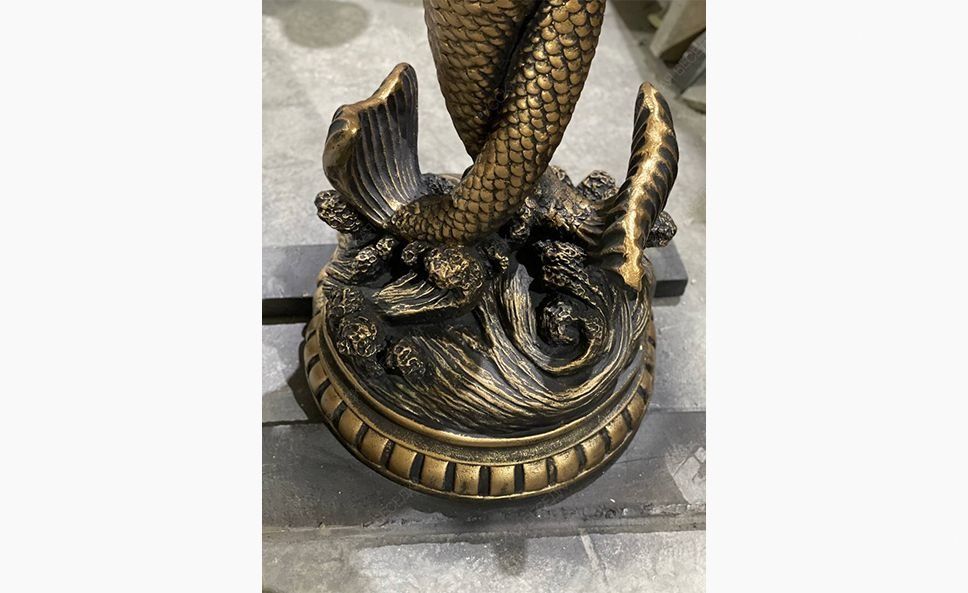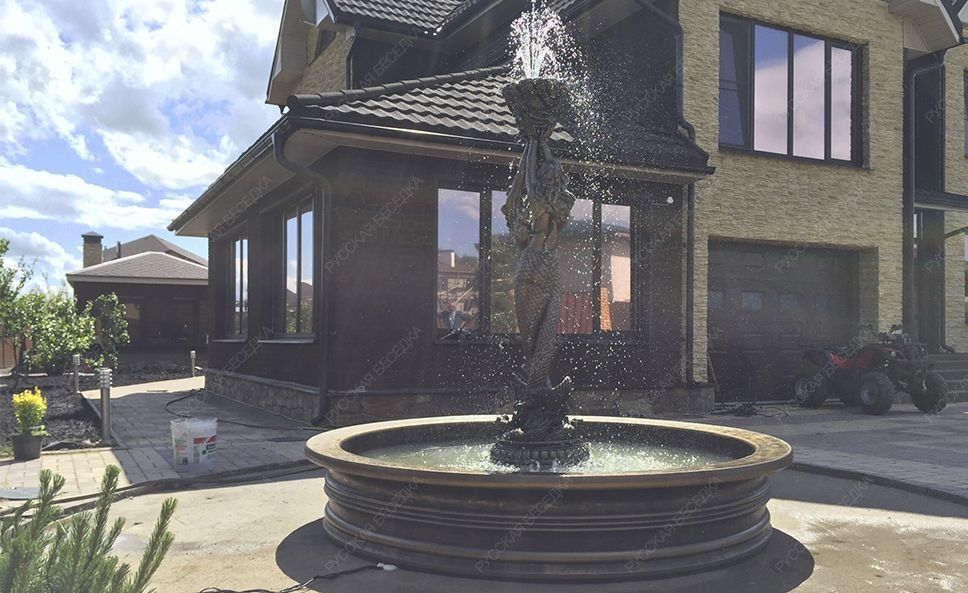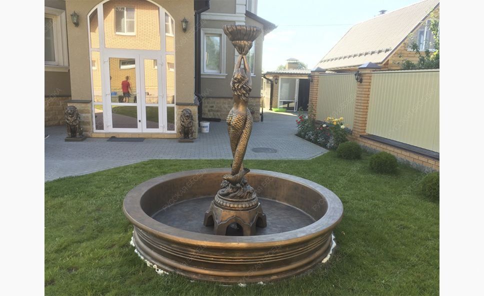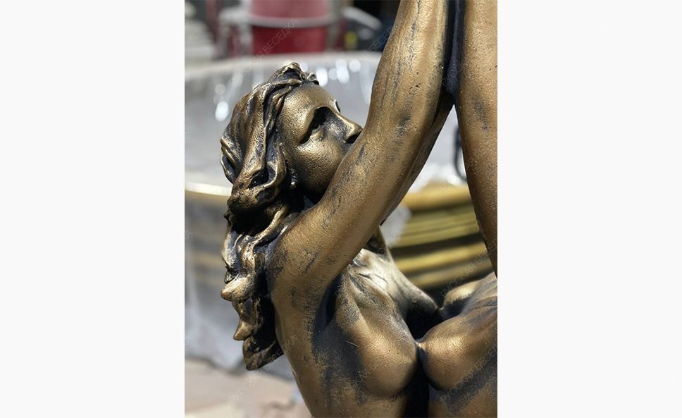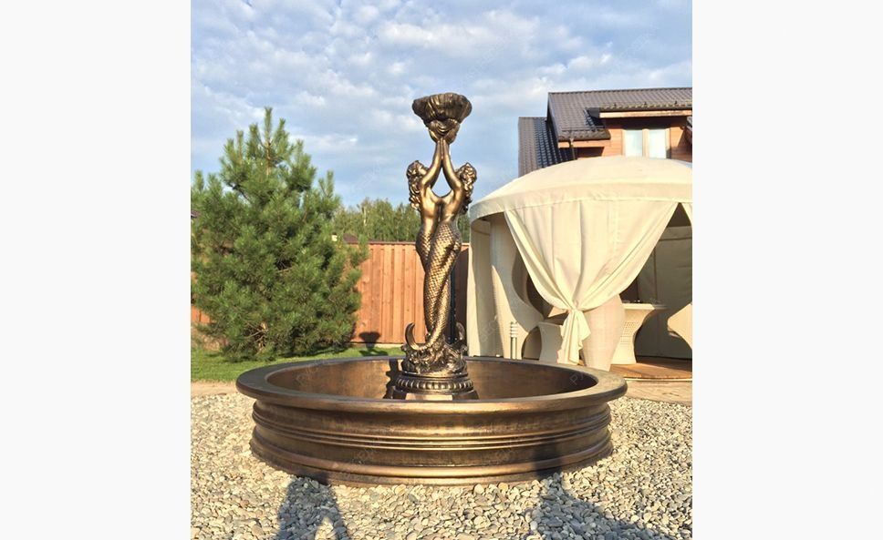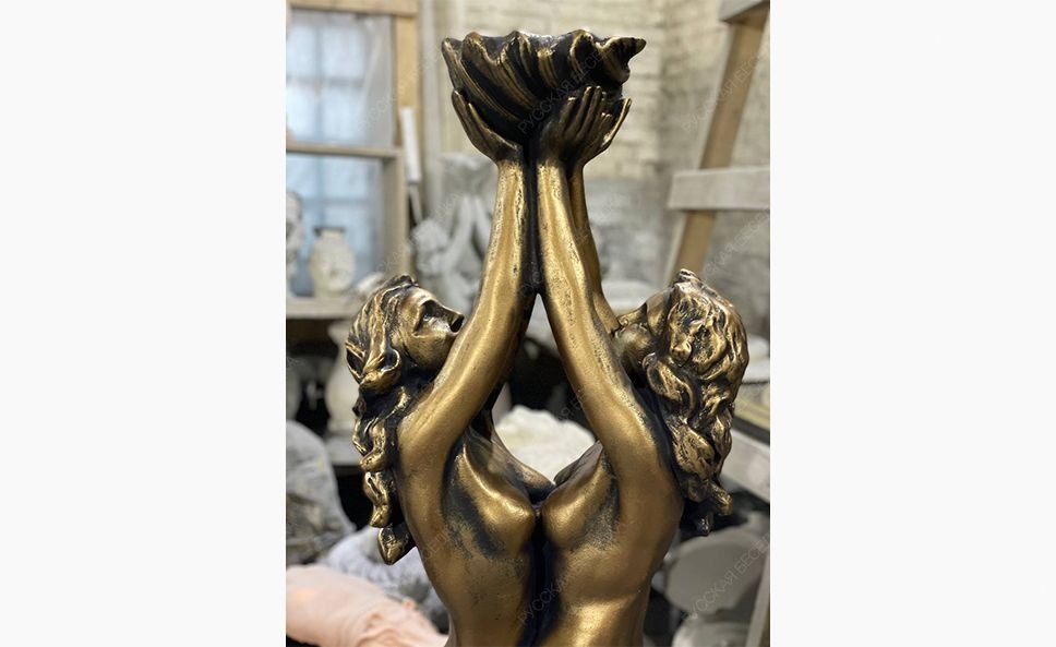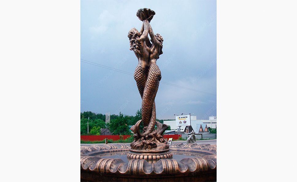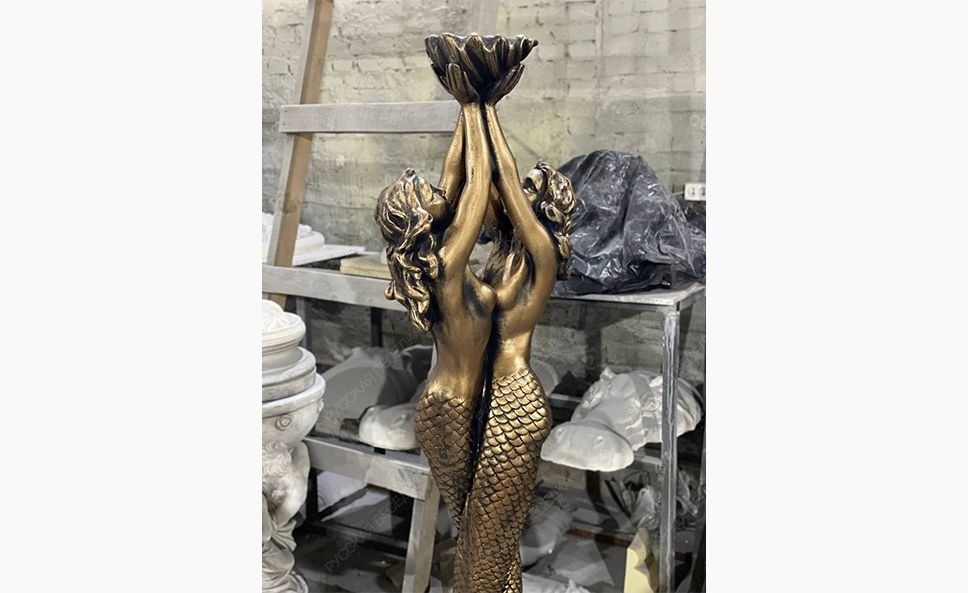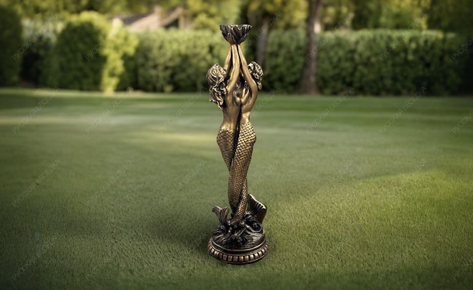 Универсальная садово-парковая композиция «Русалки» отличается чувственной пластичностью форм, филигранной детализацией фрагментов и обильной декорацией опорного основания. Русалки для сада могут использоваться как элемент ландшафтного декорирования, при необходимости украсить фасад здания, также выступить в качестве полноценного фонтана или в роли одного из его элементов.                                                                                                                               Парная статуя русалок с массивным декоративным основанием и функциональным навершием в виде чаши-ракушки, которую можно использовать в качестве вазона или фонтанчика. Наши скульптуры зарекомендовали себя как универсальный ландшафтный и архитектурный декор. Также их можно использовать как элементы больших уличных фонтанов. Бетонная скульптура в отделке под классическую бронзу хорошо приспособлена к условиям российского климата и сохраняет свой первоначальный внешний вид на протяжении многих сезонов. Создавая эту скульптуры, мы выбрали позу, которая во всех нюансах раскрывает красоту и грацию женского тела. Статуи отличаются безупречными пропорциями, реалистичной пластикой и тонкой проработкой деталей. Массивное основание имеет богатый декор и служит надежной опорой, которая обеспечивает устойчивость скульптуры на любой поверхности. Наших русалок успешно используют в качестве садовых статуй, архитектурных элементов частных домовладений и общественных заведений. В руках русалки удерживают чашу-ракушку. Она придает статуе визуальный баланс, уравновешивая массивное основание, и расширяет варианты ее использования. Благодаря чаше скульптуру можно задействовать как небольшой вазон, садовый фонтанчик или элемент большого фонтана в Москве. Для этих целей на этапе отливки мы закладываем в изделие силиконовый шланг. Установив на его конце насадку-распылитель и подключив к системе подачи воды, скульптуру преобразит эффектная струя в виде купола или гейзера. Скульптуры созданы из высокопрочного полимербетона с добавлением присадок, которые улучшают эксплуатационные характеристики материала. Отливка изделий произведена на вибростоле. Отработанная временем технология формовки позволяет добиться равномерной усадки смеси и достичь однородной структуры без полостей и других усадочных дефектов, присущих кустарному литью. Для придания дополнительной прочности скульптуры армируют. Декоративная отделка под классическую бронзу выполнена проверенными фасадными красками, не боящимися влаги, выгорания, растрескивания на морозе. Многоэтапная технология отделки предусматривает шлифовку, грунтование изделия, нанесение защитного покрытия для бетона. Краска наносится в несколько слоев с проработкой светотеневых эффектов, которые делают имитацию бронзы более реалистичной.