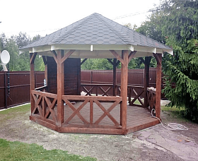 Беседка выполненная из лучших пород древесины, прослужит долгие годы и не потребует особого ухода и обслуживания. Специальные лакокрасочные материалы которые мы используем, предотвратят старение, гниение и заражение грибком конструкции кухни. Используемая огнебиозащита образует полупрозрачное полуматовое покрытие, стойкое к влаге, УФ-излучению, перепадам температуры и другим атмосферным воздействиям.